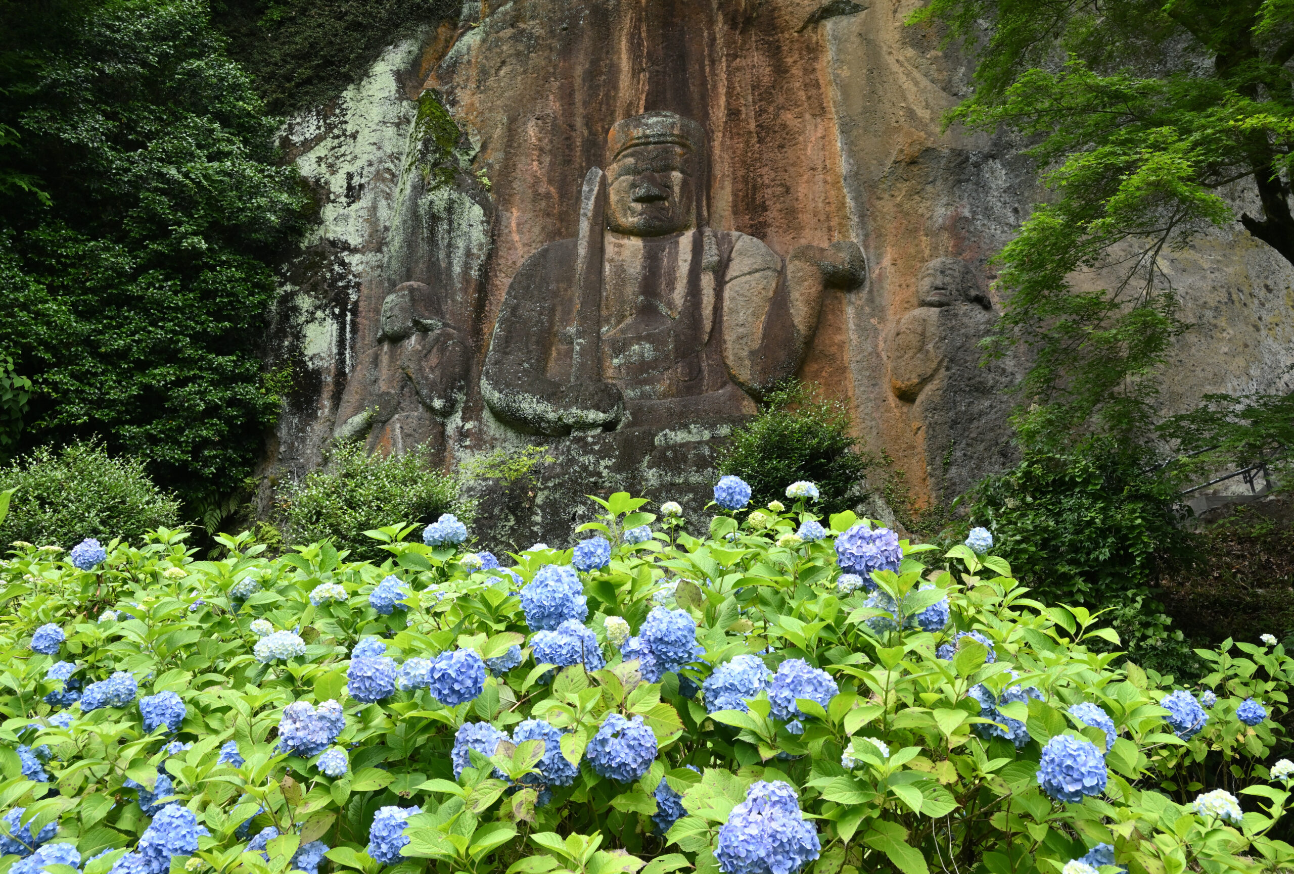 境内に彫られた磨崖仏は、台座を含めた高さが約11.3mで日本最大級です。