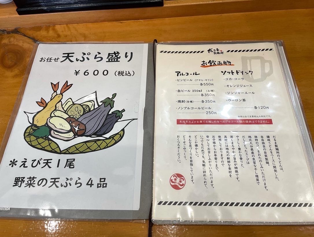 だるま製麺所のうどんは、讃岐うどんをベースに開発した、独自の自家製麺です。大分県産の良質な干し椎茸で出汁をとったスープは、優しく豊かな香りと、深くまろやかな旨味が特徴です。お腹いっぱい食べたい方にはお得な「2品トッピング」おすすめです。うどん+トッピング2品で大満足間違いなしです!