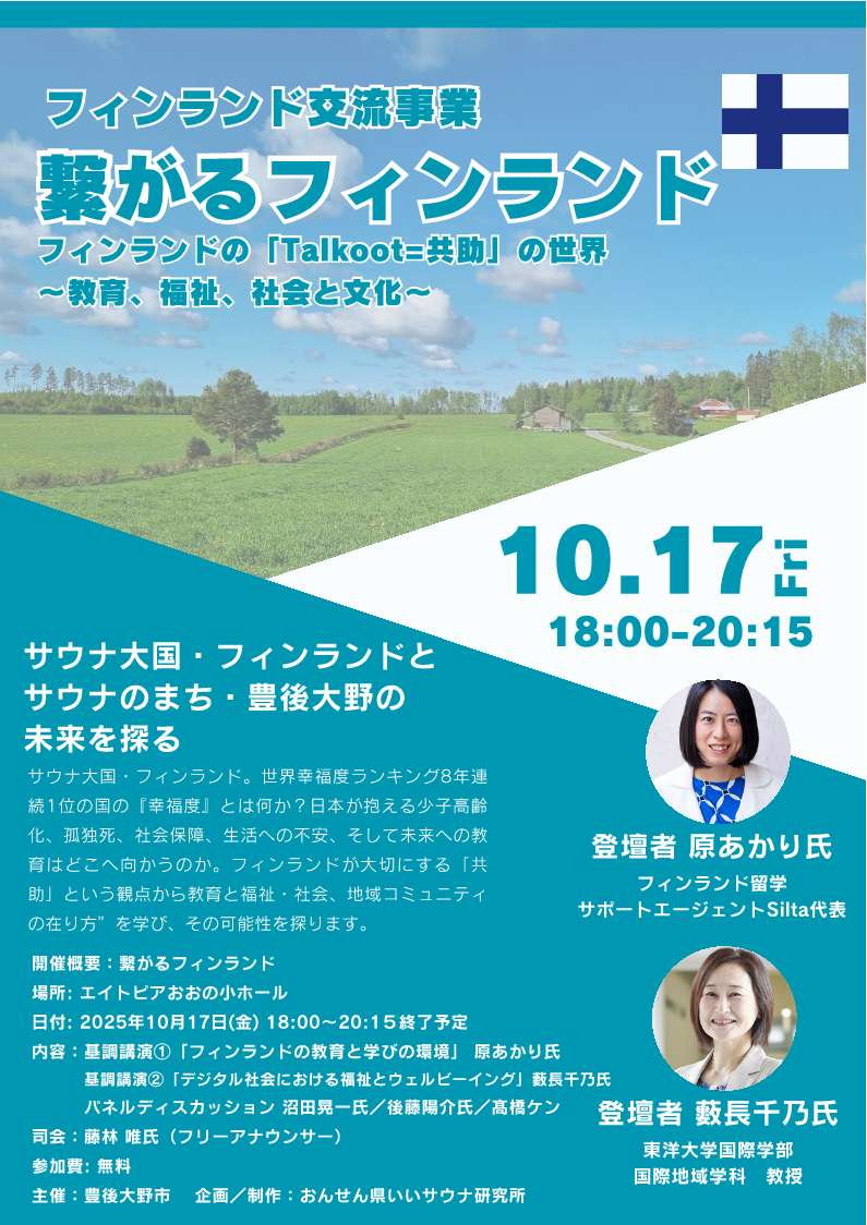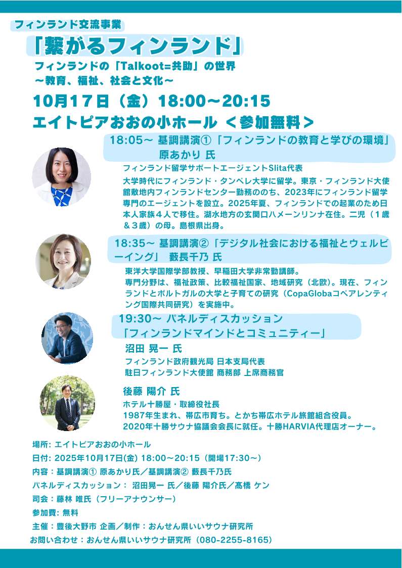 エイトピアおおのでフィンランド交流事業として基調講演やクロストークのイベントが開催されます。
