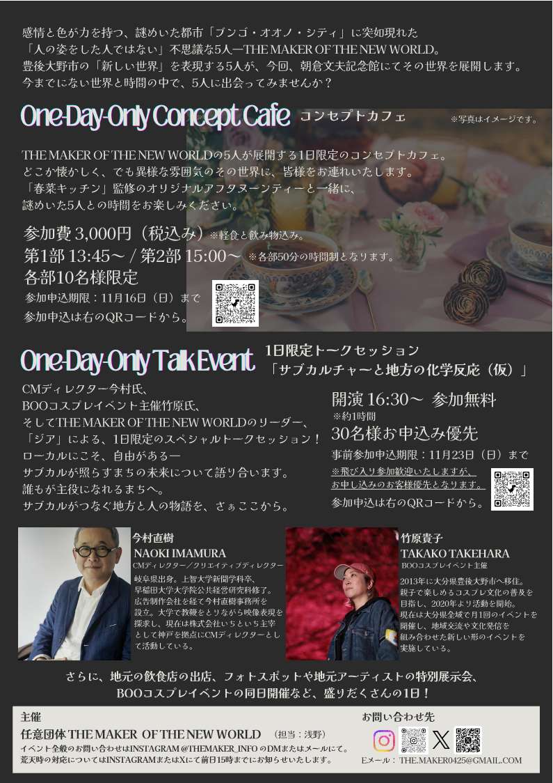 CMディレクター今村さん、BOOコスプレイベント主催竹原さん、そしてThe Maker of the New worldのリーダーによる、1日限定のスペシャルトークセッション。サブカルが照らす、まちの未来について語り合います。
