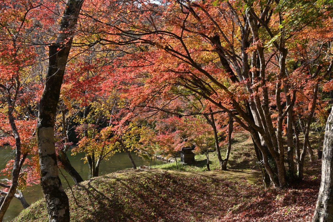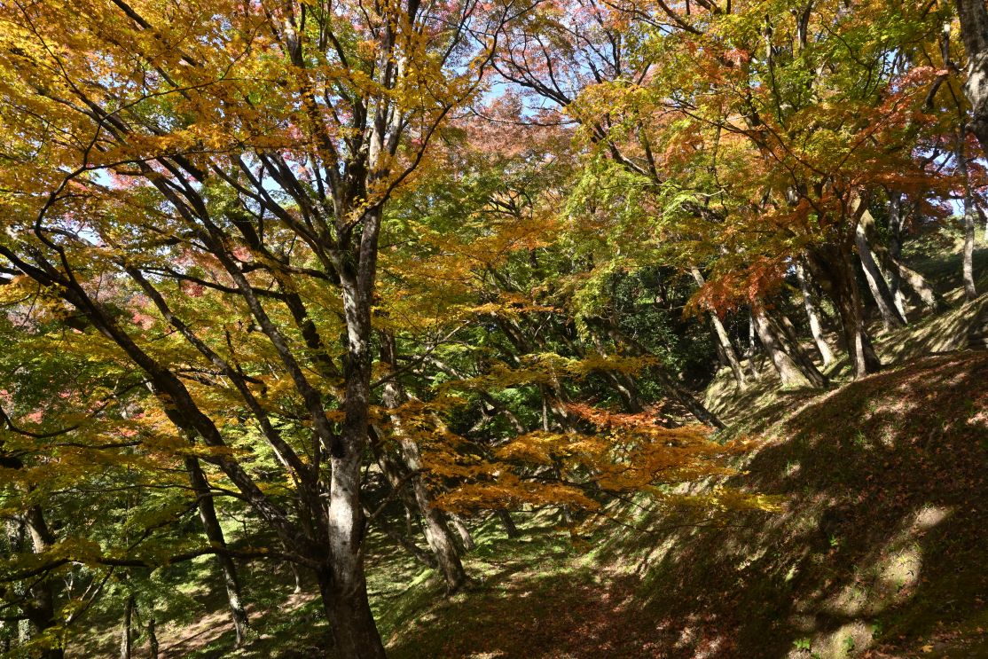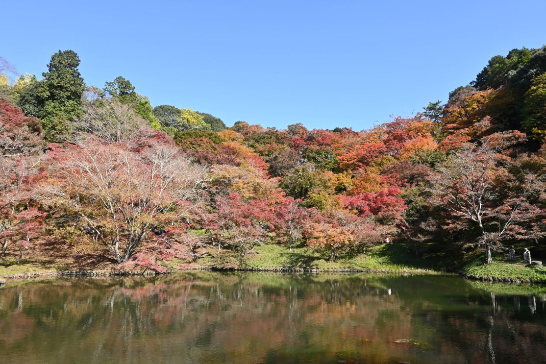 紅葉は全体でみると7割ほど進んでいます。心字池のまわりは今週が見ごろかと思います。池から離れた場所も紅葉が進んでいます。緑や黄色、赤色など、色とりどりの葉が楽しめてきれいです。風がふくとひらひらと葉が舞いはじめている木もありますが、晴れている日はとっても紅葉が鮮やかです。秋色に包まれる用作公園にでかけてみませんか。