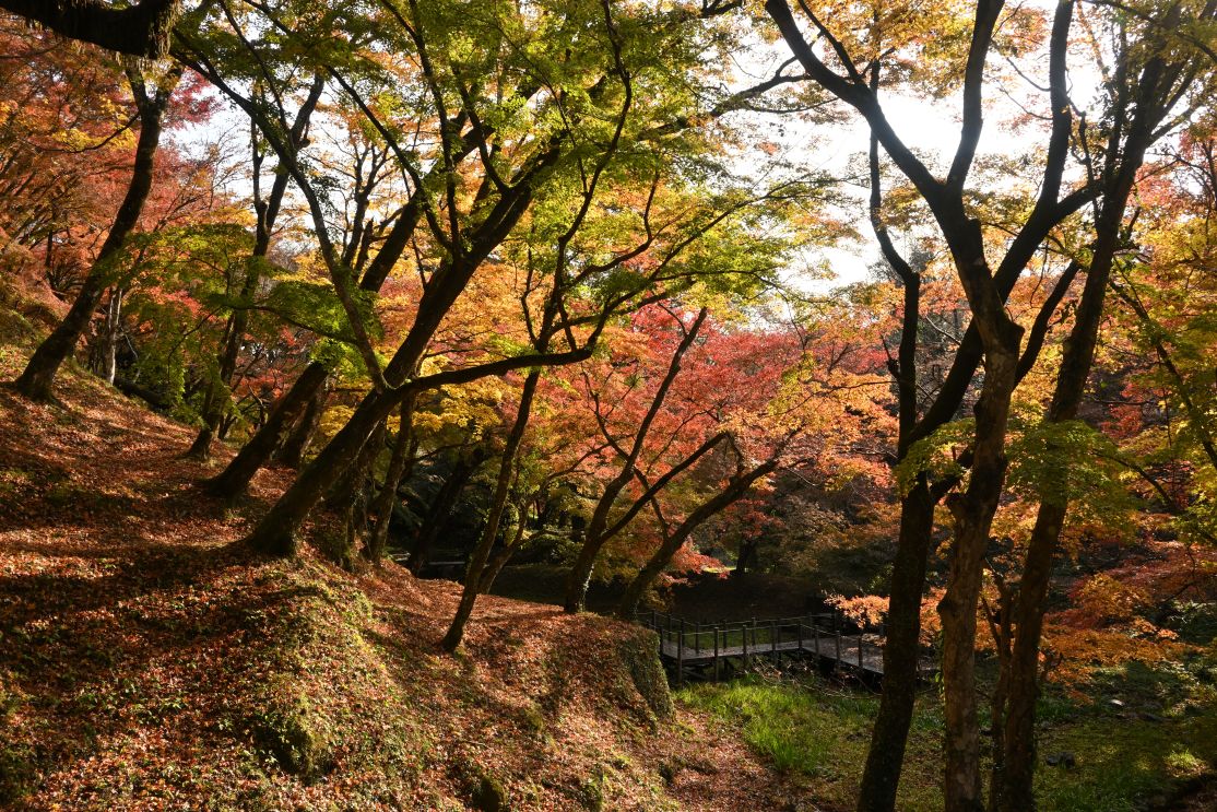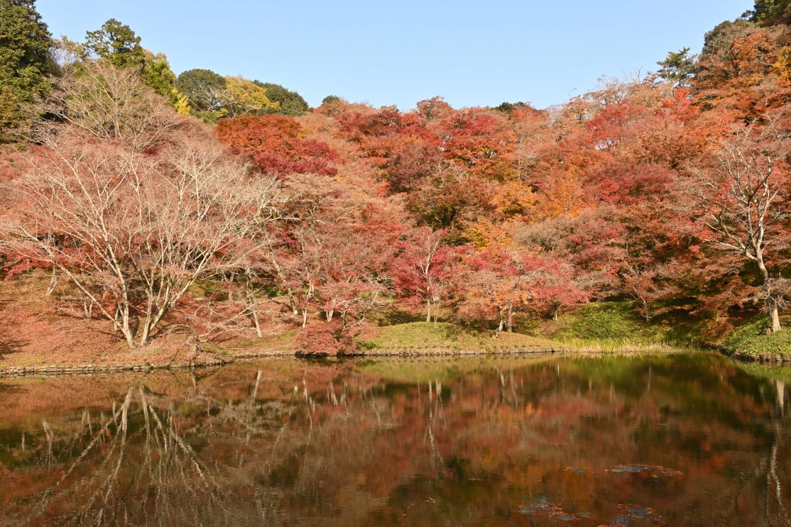 池から離れた場所は紅葉が進み、緑や黄色、赤色など、色とりどりの葉が楽しめてきれいです。