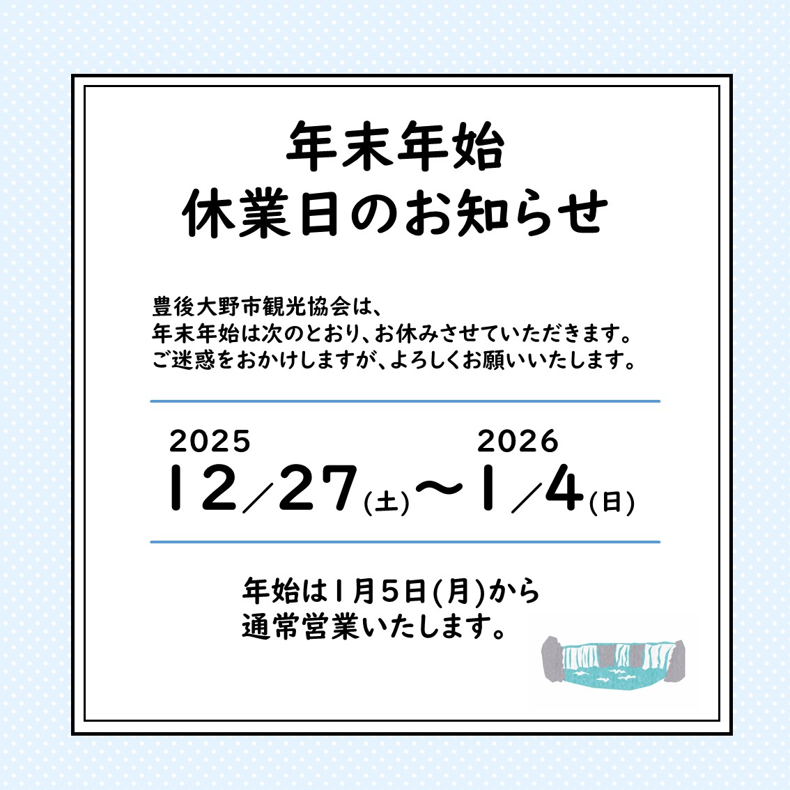 豊後大野市観光協会では、年末年始を次の期間中お休みさせていただきます。