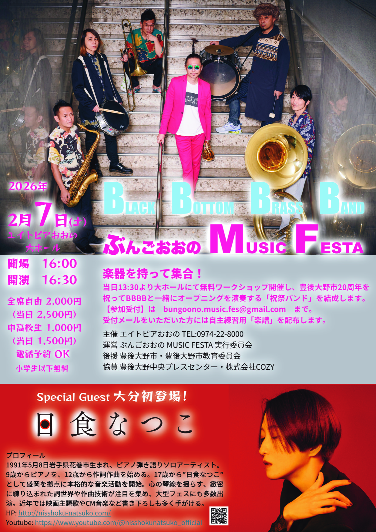 当日13:30から大ホールで無料ワークショップが開催されます。豊後大野市20周年を祝ってBBBBと一緒にオープニングを演奏する「祝祭バンド」を結成されます。