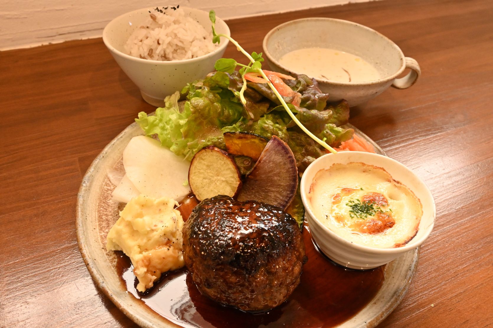 県産ハンバーグは間違いないおいしさ。旬の食材を使った副菜も丁寧な作りでどれもおいしい。