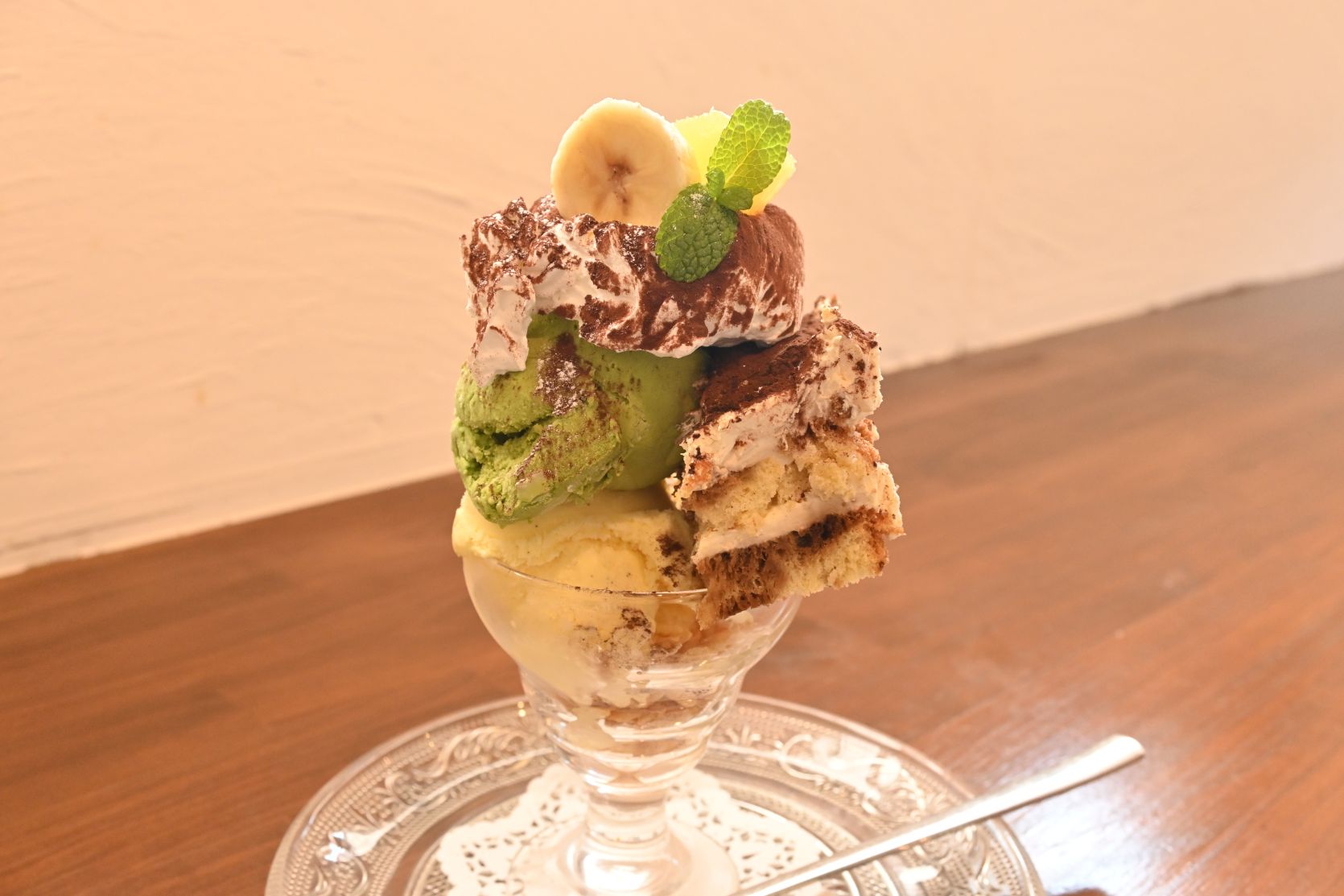 定番のパフェ。季節のフルーツに抹茶アイスとバニラアイス、手作りティラミスの存在感! ティラミスはほどよい甘さで最後まで幸せが続く至福のパフェ。