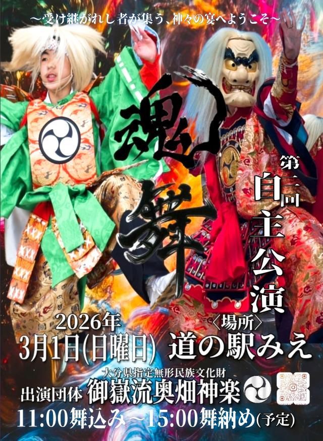 大分県豊後大野市三重町にある道の駅みえで奥畑神楽主催の自主公演が開催されます。道の駅みえの舞台を使用して、四演目の舞が披露されます。