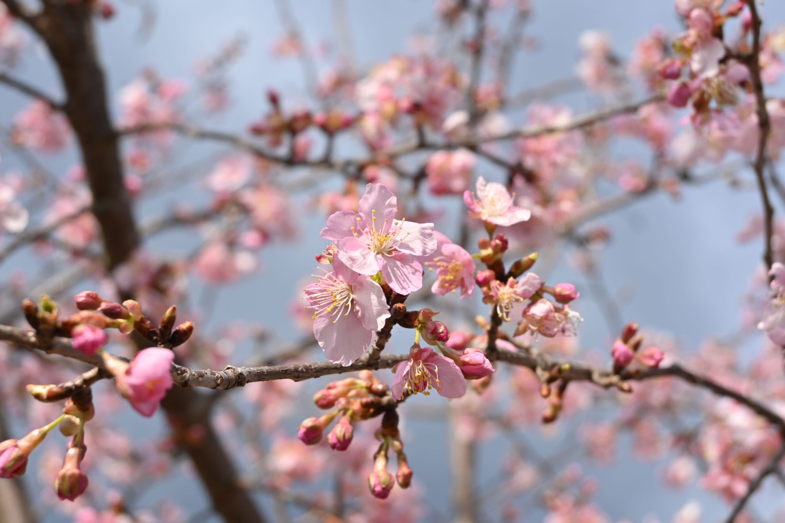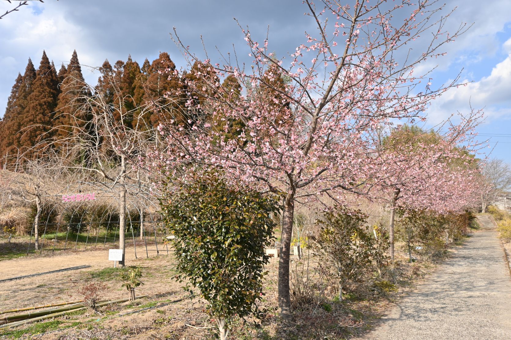 冬のイルミネーションが終わると、桜が咲きはじめます。今は約30本ほど植えている河津桜が見ごろです。
