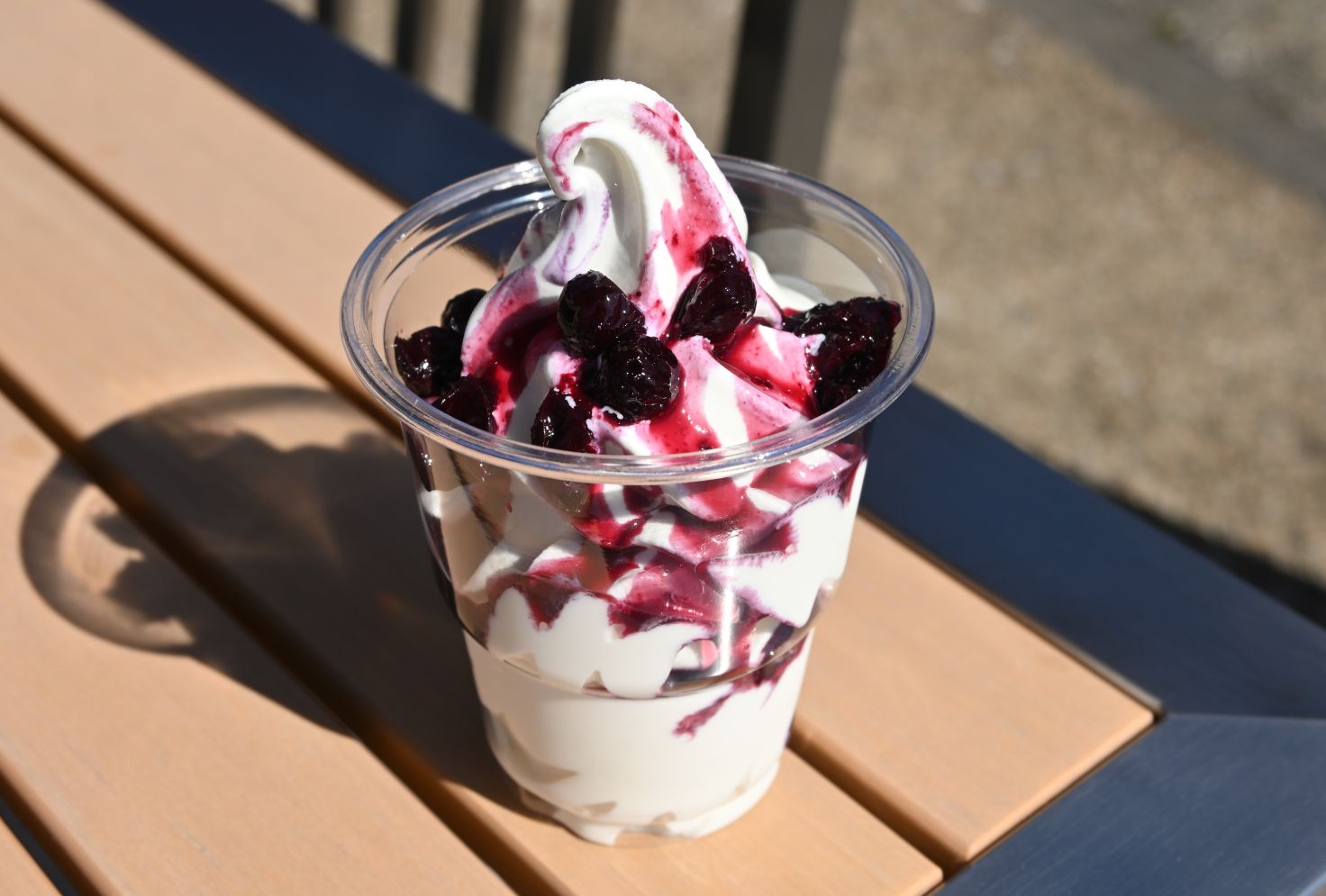 緒方産ブルーベリーの手作りソースがたっぷりかかったソフトクリーム。甘酸っぱいブルーベリーソースとソフトクリームがベストマッチ