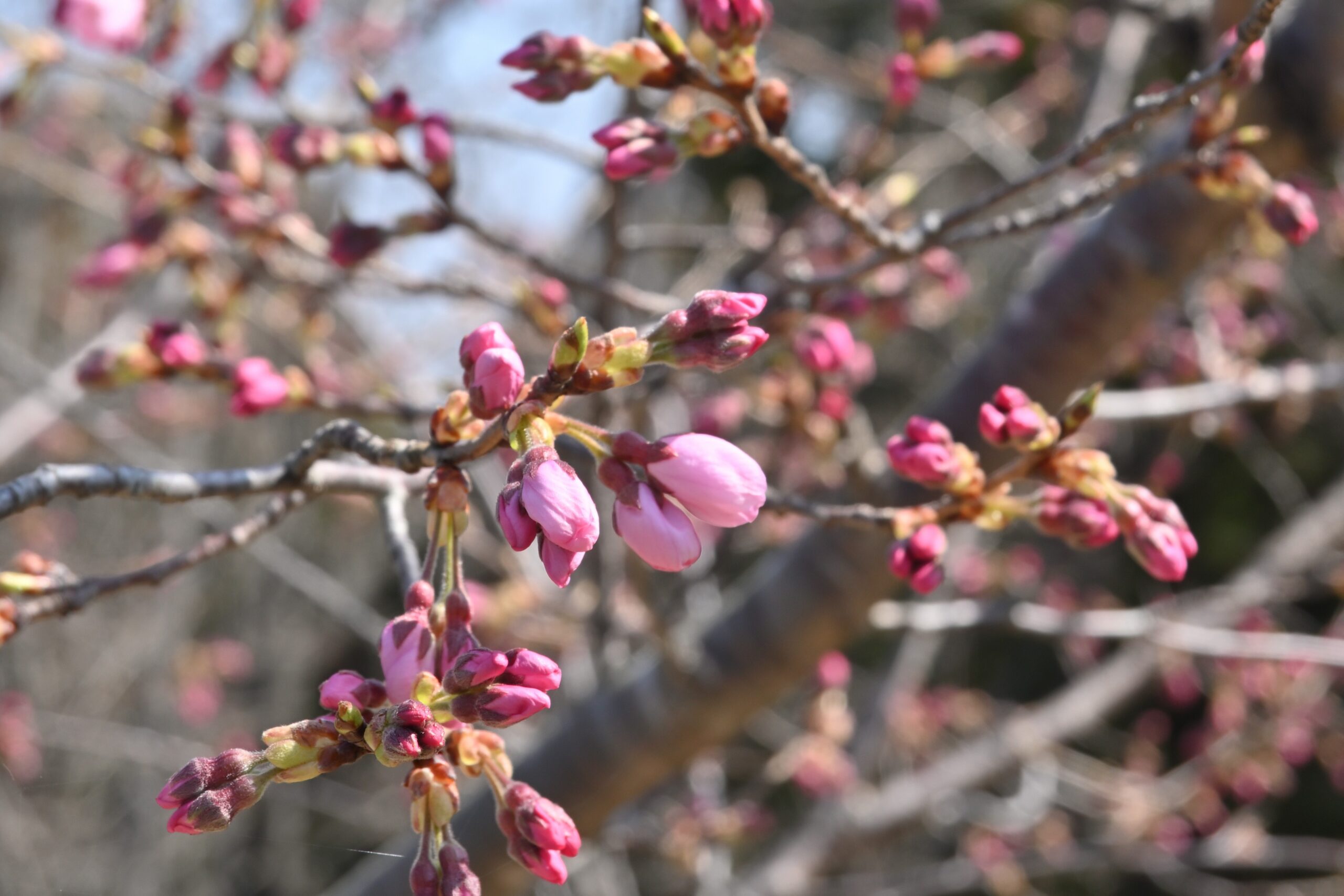 ソメイヨシノより、やや濃いピンク色の花びらであるジンダイアケボノは、ちらほらと咲き始めています。
