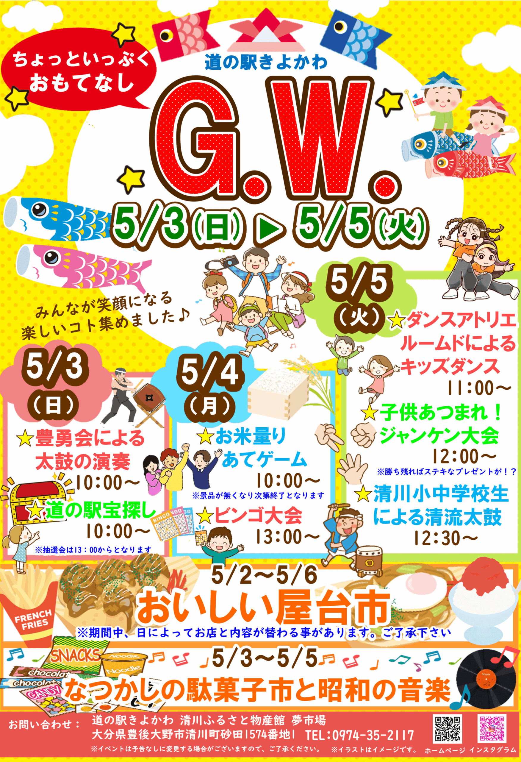 太鼓の演奏やビンゴ大会、お米の軽量宛ゲーム、キッズダンスやジャンケン大会などが開催されます。ぜひ道の駅きよかわに遊びに来てください。
